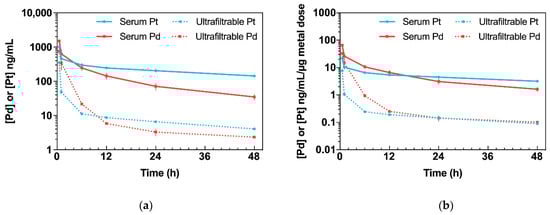 Even though the doses of Pd2Spm (3 mg/kg) and cisplatin (3.5 mg/kg) used in this study were somewhat similar, the actual dose of Pd administered to the animals was only half of the dose of Pt owing to the difference in the metal composition in each compound (dinuclear versus mononuclear in Pd2Spm and cisplatin, respectively; please see Section 4.8, for further clarification). Therefore, to obtain biologically meaningful comparisons of relative metal kinetics, the mean Pd and Pt concentrations were normalized to the administered metal dose (Figure 2b). Regarding the metal dose-normalized concentration–time profiles in serum ultrafiltrate, a higher concentration of free Pd than Pt was found during the 0.5–12 h period, reaching equivalent concentrations for both metals during the 24–48 h period. The dose normalization also revealed that animals treated with Pd2Spm reached a 3- and a 4.2-fold higher Cmax in serum and serum ultrafiltrate, respectively, compared to cisplatin. Additionally, considering the dose-normalized areas under the curve (AUCs), Pd2Spm administration resulted in a 1.2- (p > 0.05) and a 4.3-fold (p < 0.001) higher AUC for Pd in serum and serum ultrafiltrate when compared to cisplatin, respectively.