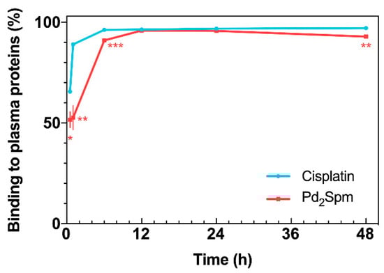 Drug binding to plasma proteins versus time, for cisplatin and Pd2Spm. Data are expressed as mean ± SEM (n = 5 animals per time point) and were compared with Student’s t-test. * p < 0.05, ** p < 0.01, *** p < 0.001.