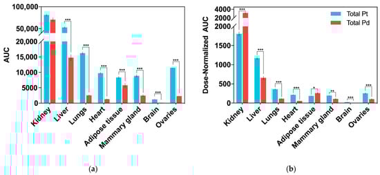 Biodistribution of total Pd (from Pd2Spm, 3 mg/kg bw) and Pt (from cisplatin, 3.5 mg/kg bw) in tissues after single intraperitoneal bolus injection in Balb/c mice. Data are expressed as mean ± SEM (n = 5 animals per time point) and were compared with Student’s t-test. * p < 0.05, ** p < 0.01, *** p < 0.001. (a) AUC0-48h (area under the Pd/Pt concentration–time curve). Units: h × ng/g of tissue; (b) dose-normalized AUC0–48 h (area under the Pd/Pt concentration–time curve). Units: h × ng/g per µg metal dose.