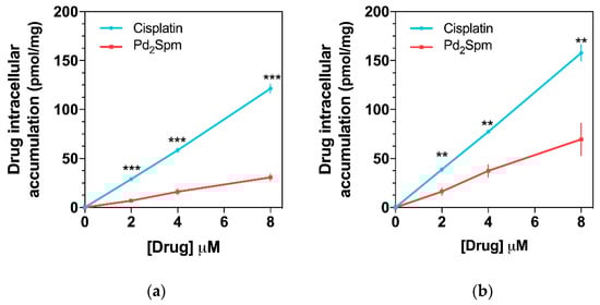 Since Pd2Spm has already shown promising in vitro anticancer activity against several cisplatin-resistant cancers [19,28], the in vitro cellular uptake/accumulation of either Pd2Spm or cisplatin in triple-negative breast cancer cells—MDA-MB-231 (from pleural metastasis of breast carcinoma) and HCC-1143 (from invasive ductal breast carcinoma)—was also evaluated by ICP-MS. The results of Pd2Spm or cisplatin accumulation in cells treated with equimolar drug concentrations (between 2 and 8 µM) are depicted in Figure 5 and evidenced a lower intracellular Pd2Spm increase as compared to cisplatin for both MDA-MB-231 and HCC-1143 cells (Figure 5a,b, respectively). This cellular drug uptake was shown to increase linearly with drug concentration in the cell culture medium, suggesting passive transport as the primary mechanism of cellular uptake for the two compounds. Interestingly, a higher accumulation of Pd2Spm (and cisplatin) was observed in HCC-1143 cells relative to MDA-MB-231 cells.