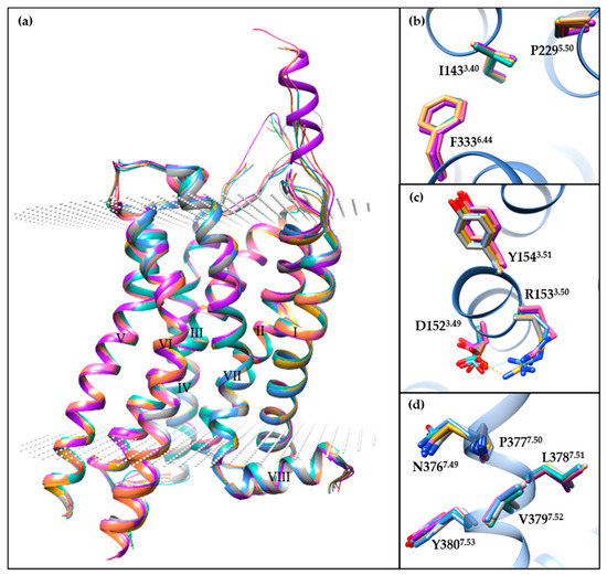 A comparison of the different small-molecule-bound 5-HT2BR crystal structures. (a) The overall architecture of 5-HT2BR/ERG (cornflower blue, PDB ID: 4IB4), 5-HT2BR/ERG (dark gray, PDB ID: 4NC3), 5-HT2BR/LSD (hot pink, PDB ID: 5TVN), 5-HT2BR/lisuride (light sea green, PDB ID: 6DRX), 5-HT2BR/methylergometrine (salmon, PDB ID: 6DRY), 5-HT2BR/methysergide (purple, PDB ID: 6DRZ), 5-HT2BR/LY266097 (goldenrod, PDB ID: 6DS0) structures aligned through the Cα atoms of residues in helices I to VIII. The 5-HT2BRs are displayed as ribbon cartoons, and the membrane boundaries are displayed as white dots, according to the Orientations of Proteins in Membranes database. (b–d) Specific comparison of residues in (b) PIF, (c) D(E)RY and (d) NPxxY motifs. For clear visualization, residues apart from the motif are hidden, with the exception of the 5-HT2BR/ERG structure (PDB ID: 4IB4). Molecular images were generated using the UCSF Chimera software [115].