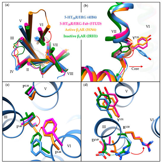 A comparison of the 5-HT2BR/ERG (cornflower blue, PDB ID: 4IB4), the 5-HT2BR/ERG-Fab (magenta, PDB ID: 5TUD), the active-state β2AR (orange, PDB ID: 3SN6) and the inactive-state β2AR (forest green, PDB ID: 2RH1) crystal structures. (a) Intracellular view of the overall architecture. The outward movement of helix VI upon activation is indicated by a red arrow. (b) A comparison of structural features in helix VII. The slight inward movement of helix VII and rotation of Y7.53 in the NPxxY motif towards helix VI are highlighted by red arrows. (c,d) A comparison of the residues in (c) PIF and (d) D(E)RY motifs. For clear visualization, residues apart from the motif are hidden, with the exception of the 5-HT2BR/ERG structure (PDB ID: 4IB4). The obvious conformational changes of specific residues upon activation are shown as red arrows. Molecular images were generated using the UCSF Chimera software [115].