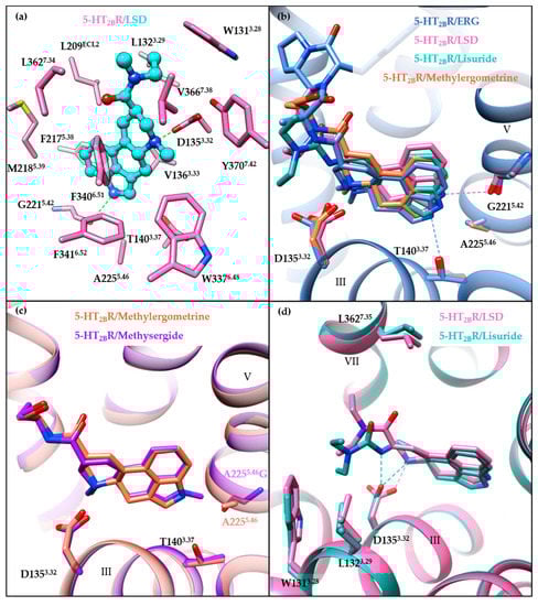 Overview of receptor–ligand interactions in the binding pocket. (a) Receptor–ligand interactions in the binding pocket of the 5-HT2BR/LSD structure (PDB ID: 5TVN). Residues of the 5-HT2BR are colored in hot pink, and LSD is colored in cyan. (b) A comparison of the specific interactions in the OBP of ergoline ligand-bound structures: 5-HT2BR/ERG (cornflower blue, PDB ID: 4IB4), 5-HT2BR/LSD (hot pink, PDB ID: 5TVN), 5-HT2BR/lisuride (light sea green, PDB ID: 6DRX), and 5-HT2BR/methylergometrine (salmon, PDB ID: 6DRY). For clear visualization, only the backbone of 5-HT2BR/ERG is shown as a ribbon cartoon. The hydrogen bond interactions are displayed as dashed lines. (c) Comparison of the binding mode of the 5-HT2BR/methylergometrine (salmon, PDB ID: 6DRY) and the A2255.46G mutant 5-HT2BR/methysergide (purple, PDB ID: 6DRZ) structures. (d) Comparison of the specific interactions in the EBP of the 5-HT2BR/LSD (hot pink, PDB ID: 5TVN) and the 5-HT2BR/lisuride structures (light sea green, PDB ID: 6DRX). Hydrogen bond interactions are shown as dashed lines. Molecular images were generated using the UCSF Chimera software [115].
