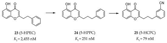 - Kim, M.; Truss, M.; Pagare, P.P.; Essandoh, M.A.; Zhang, Y.; Williams, D.A. Structure Activity Relationship Exploration of 5-Hydroxy-2-(3-Phenylpropyl)Chromones as a Unique 5-HT2B Receptor Antagonist Scaffold. Bioorg. Med. Chem. Lett. 2020, 30, 127511. [Google Scholar] [CrossRef] [PubMed]