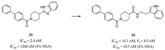 RQ-00310941 (12, Table 2) is an antagonist of the 5-HT2BR with high affinity (Ki = 2.0 nM) and good selectivity (>2000-fold selectivity against more than 60 GPCRs, ion channels, and enzymes) [64]. In vivo studies in the trinitrobenzene sulfonate-induced visceral hypersensitivity rat model indicated that RQ-00310941 has the therapeutic potential for diarrhea-predominant IBS [64]. Specifically, RQ-00310941 could attenuate the distal colon sensitivity (61% inhibition at 1 mg/kg, per os (p.o.)) and suppress the restraint stress-induced defecation (95% inhibition at 10 mg/kg, p.o.) without affecting normal defecation at high dose (30 mg/kg, p.o.) [64].