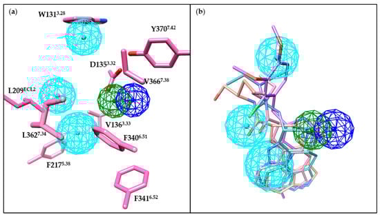 All of the small-molecule ligands in the published 5-HT2BR co-crystal structures occupy the OBP that is presumed as the 5-HT’s binding pocket, as well as regions outside the OBP and close to the extracellular loops, termed as the extended binding pocket (EBP) [120]. Taking LSD’s binding mode as an example, the ergoline ring system occupies the OBP by interacting residues in helices III, V, VI, and VII (Figure 4a). These interactions are commonly observed in aminergic GPCRs structures, including a conserved salt bridge between the positively charged nitrogen of the ligand and the carboxylic acid of D3.32, and π-π stacking interactions formed by the aromatic system of the ligand with residues F6.51 and F6.52 in helix VI. In the EBP, the diethylamide moiety of LSD interacts with residues in the extracellular side of helices III and VII as well as ECL2.