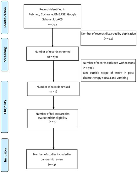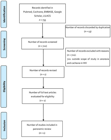 To increase consistency between the results, the three reviewers reviewed the 735 articles selected for the indication of anorexia and cachexia in HIV, 742 articles for the indication of post-chemotherapy nausea and vomiting, and 763 articles for the indication of neuropathic pain in multiple sclerosis. A free web application, Rayyan, was used as an aid in conducting systematic reviews, in which the analysis of the searches and elimination of duplicates was carried out according to each indication. Disagreements in the selection of the studies, and the extraction of the data by consensus and discussion with the other reviewers, if necessary, was documented in PRISMA format for panoramic reviews [33,34,35].