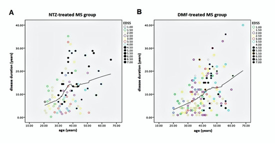 The Spearman rank test evidenced strong statistical correlation between age and DD (r = 0.42; p < 0.001), as well as between age and EDSS (r = 0.52; p < 0.001). Furthermore, DD correlated with EDSS (r = 0.46; p < 0.001), as expected. In all cases, we found a direct and significant statistical correlation between time-dependent variables and EDSS. Consistently, we found a strong direct correlation between the age at onset and age (r = 0.62; p < 0.001), DD (r = 0.37; p < 0.001) and EDSS (r = 0.18; p < 0.001). Figure 1 shows the correlation between age and DD with EDSS-labeled cases from the NTZ- and DMF-treated MS groups.