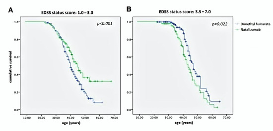 Kaplan–Meier curves representing the proportion of patients with an EDSS status score of 1.0–3.0 (A) and 3.5–7.0 (B) according to age in both the NTZ- and DMF-treated MS study populations. The highest curve in (A) represents the better ability over time of NTZ to maintain the patients at a low grade of disability; the highest curve in (B) represents the better ability over time of DMF to stabilize the EDSS in patients that reached a high grade of disability. EDSS—Expanded Disability Status Scale; NTZ—Natalizumab; DMF—Dimethyl fumarate.