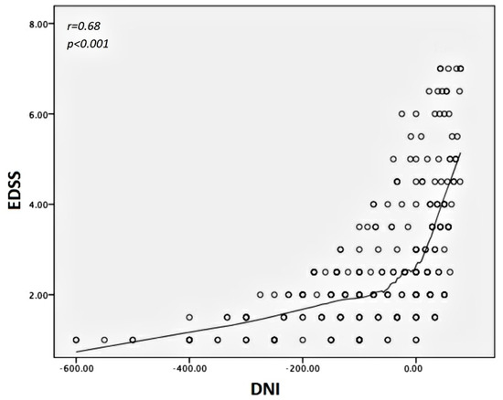 Scatter plot showing statistical correlation between DNI and EDSS scores. Note the increased value of DNI from the low to the high grade of disability, meaning that the main differences in disability between NTZ- and DMF-treated patients are concentrated in the low grade of EDSS. DNI is expressed by the ratio between EDSS scores from patients treated with NTZ and EDSS scores from patients treated with DMF, matched for age, disease duration and age at onset of disease. DNI—Differential Neurological Impairment; EDSS—Expanded Disability Status Scale; NTZ—Natalizumab; DMF—Dimethyl fumarate.