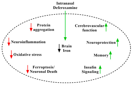 - Fine, J.M.; Forsberg, A.C.; Stroebel, B.M.; Faltesek, K.A.; Verden, D.R.; Hamel, K.A.; Raney, E.B.; Crow, J.M.; Haase, L.R.; Knutzen, K.E.; et al. Intranasal Deferoxamine Affects Memory Loss, Oxidation, and the Insulin Pathway in the Streptozotocin Rat Model of Alzheimer’s Disease. J. Neurol. Sci. 2017, 380, 164–171. [Google Scholar] [CrossRef] [PubMed]