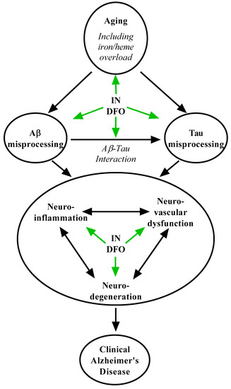 For many years, the amyloid hypothesis has dominated research on and understanding of AD pathoetiology [90], but the repeated failure of therapeutics targeting amyloid-β (Aβ) has undermined testimony of its accuracy [7,91]. Rather, converging lines of evidence suggest an alternative paradigm defining AD as a spectrum of decline caused by the interaction of aging-driven Aβ and tau neuropathology (Figure 2). In this framework, aging drives abnormal tau processing driving neurodegeneration [92,93,94] with Aβ pathology accelerating [91,93,94,95] and contributing to [90,91,95,96] this process, reconciling spatiotemporal pathological data across the aging population [8,94,97] with the causes of familial forms of AD [90]. The process of consequent cognitive decline appears to involve a dynamic interplay of progressive synaptic dysfunction, neurodegeneration [69,91,95], neuroinflammation [92,98], neurovascular breakdown [99], and the collapse of large-scale brain networks [100]. IN DFO can act on multiple processes in this cascade to slow disease progression. DFO has been shown to reduce Aβ aggregation [31,33,35,77] and hyperphosphorylation of tau [34,101], and involvement of transition metals including iron is thought to contribute to the toxicity of these pathological hallmarks [70,73]. DFO is a robust inhibitor of glycogen synthase kinase-3β (GSK-3β) [30,31,32,34], a well-established therapeutic target in tauopathy, and DFO was found to reverse tau-mediated neurodegeneration in rabbits treated with aluminum [101]. GSK-3β is also hypothesized as a major link between accumulation of Aβ and consequent hyperphosphorylation of tau in AD [91,93,96], placing DFO in position to suppress this acceleratory process. Additionally, iron accumulation and iron-mediated neuronal ferroptosis have been increasingly implicated as contributing to AD neurodegeneration [69,72,73], and IN DFO directly suppresses this process including iron-associated oxidative stress [42,78]. DFO likewise ameliorates neuroinflammation [30,38,81,82,83] which is hypothesized to contribute to Aβ toxicity and damage in AD.