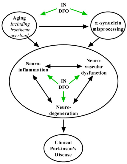 Putative mechanisms of IN DFO in Parkinson’s disease. IN DFO engages pathways that limit age-related processes such as iron accumulation, α-synuclein misprocessing, neuroinflammation, neurovascular dysfunction, and neurodegeneration to counter the Parkinson’s pathological process and loss of dopaminergic neurons.