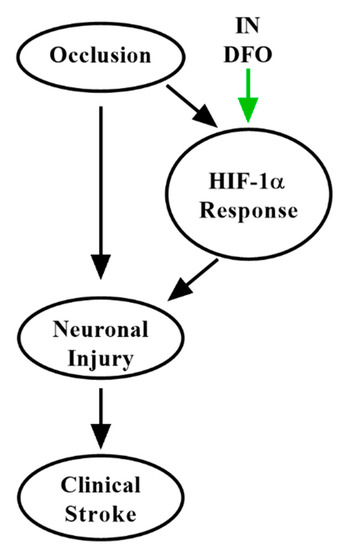 Ischemic stroke is one of the leading causes of mortality and disability. Therapeutic use of DFO has shown considerable preclinical efficacy in animal models of stroke. IN DFO was found to significantly reduce infarct volume with middle cerebral artery occlusion (MCAO) in rats with either pre- or post-treatment [24]. These results are supported by efficacy of systemically administered DFO in the same model [113], as well as in rat ischemia induced by carotid ligation [114]. Furthermore, systemic DFO has been shown to cause robust ischemic preconditioning in the rodent brain, a strategy which is thought to ameliorate further damage due to multiple occlusive events, a common complication of stroke [76,115,116,117]. These results are similarly supported by a considerable body of similarly positive results from other iron chelators [70], supporting a real therapeutic role for this strategy in stroke treatment.