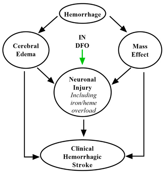 DFO has been perhaps best studied in the context of intracranial hemorrhage (ICH), hemorrhagic events constituting around 15% of all strokes. Its substantial preclinical evidence in intracerebral hemorrhage and subarachnoid hemorrhage as well as mechanisms have been extensively reviewed elsewhere [27,85,118]. Succinctly, DFO is thought to chelate redox-active iron released from hemoglobin and myoglobin following ICH [12], minimizing secondary brain damage (Figure 5). Notably, the i-DEF trial evaluating IV DFO after intracerebral hemorrhage did not suggest therapeutic benefit [118]. However, this study was limited by systemic toxicity associated with higher doses of IV DFO, and the low doses studied may not have been sufficient to generate adequate CNS coverage following ICH [119]. IN administration may overcome this hurdle by targeting DFO to the CNS (up to 200-fold) as compared to systemic modes of delivery [24]. Another trial found that administration of DFO positively impacted several endpoints following ICH, although the investigators concluded more conclusive trials were required [120]. Given its substantial preclinical efficacy and the advantages of IN delivery, further investigation of IN DFO in ICH is still warranted.