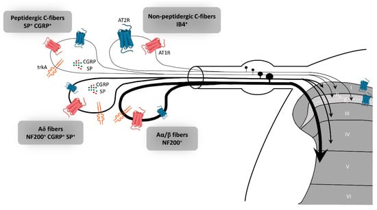 - Chakrabarty, A.; Liao, Z.; Smith, P.G. Angiotensin II Receptor Type 2 Activation Is Required for Cutaneous Sensory Hyperinnervation and Hypersensitivity in a Rat Hind Paw Model of Inflammatory Pain. J. Pain 2013, 14, 1053–1065. [Google Scholar] [CrossRef]