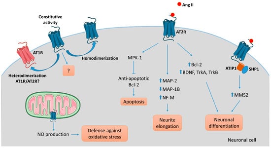 AT2R-mediated intracellular signaling pathways involved in neuronal cells. Several intracellular signaling pathways are associated with AT2R activation in neuronal cells leading to apoptosis via activation of the phosphatase MPK-1, neurite elongation via reorganization of the cytoskeleton, or neuronal differentiation in part via upregulation of growth-factors, depending on the cell type, the context, and the environment. To date, ATIP1 is identified as a partner of AT2R involved in intracellular signaling pathway and trafficking in neuronal cells. While the evidence of an ATIP/AT2R complex comes from experiments on central nervous system neurons, we could hypothesize that a similar system exists in PNS neurons. AT2R signaling may antagonize AT1R-mediated signaling by a direct heterodimerization between the two. As well, homodimerization of AT2R might result in ligand-independent signaling.