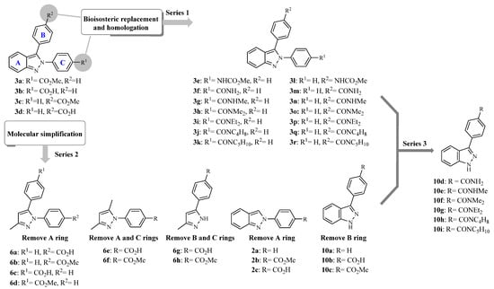 Indazole is an important heterocyclic scaffold in medicinal chemistry since it is associated with a broad range of biological activities, e.g., anti-inflammatory, antiprotozoal, antihypertensive, anticancer, antitumor, antifungal, antibacterial, anti-HIV, antiplatelet, and others [10,11,12,13,14,15,16,17]. Previous studies by our group showed that some 2,3-diphenil-2H-indazole derivatives substituted with methyl ester or carboxylic acid groups (compounds 3a–d; Figure 1) have in vitro activity against C. albicans and C. glabrata. Particularly, compounds 3a and 3c showed a minimum inhibitory concentration (MIC) of 3.807 mM and 15.227 mM against C. albicans and C. glabrata, respectively [17]. However, the information available regarding the structural requirements for anticandidal activity is still limited. Therefore, it is necessary to design and synthesize new indazole derivatives to gain knowledge about the structural modifications required to improve the candicidal activity. As part of our efforts in the search for candicidal compounds, initially, fourteen 2,3-diphenyl-2H-indazole derivatives (series 1; Figure 1) were designed by bioisosteric replacement and homologation. It is worth mentioning that esters (e.g., 3a and 3c) can be easily hydrolyzed to carboxylic acids and are usually considered prodrugs; therefore, we proposed a replacement by amides that are a similar functional group, but slightly more stable. Different amines were considered to explore the effect of bulky substituents in the activity. Also, fourteen derivatives, which include 3,5-1H-pyrazole, 2-phenyl-2H-indazole and 3-phenyl-1H-indazole, were designed employing molecular simplification strategies by removing rings from the original 2,3-diphenil-2H-indazole scaffold (series 2, Figure 1). This strategy has been used to reduce structural complexity, improve physicochemical properties, and to find the minimum molecular features that are necessary for the anticandidal activity. Compounds proposed were synthesized and tested in vitro against four Candida strains. Then, taking advantage of the results revealed by the biological evaluations, the third series of six 3-phenyl-1H-indazole carboxamides were synthesized and tested.