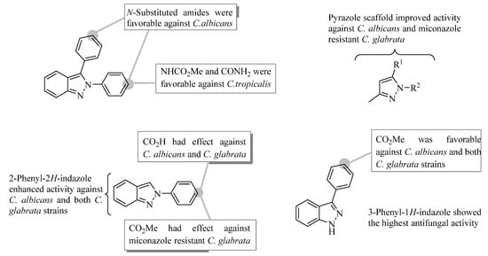 According to these results, principally structure-activity relationship features derived from compounds tested are exhibited in Figure 2. The replacement of the carbonyl group by N-substituted carboxamides on 2,3-diphenyl-2H-indazole nucleus led to an increase in the growth inhibitory activity against C. albicans. The molecular simplification of 2,3-diphenylindazole improved the antifungal activity against Candida strains tested. The 3,5-disubstituted pyrazoles displayed better growth inhibition than the 2,3-diphenylindazole analogs against C. albicans and miconazole resistant C. glabrata. At the same time, 2-phenyl-2H-indazoles were active against C. albicans and both C. glabrata strains. It is important to emphasize that 3-phenyl-1H-indazole derivatives showed the highest antifungal activity against all Candida strains tested except for C. tropicalis.