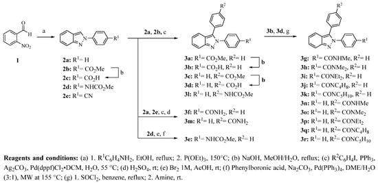 The synthesis of 2,3-diphenyl-2H-indazole derivatives 3a–r was carried out as outlined in Scheme 1. 2-Phenyl-2H-indazoles (2a, 2b, 2d, and 2e) were synthesized by the Cadogan reaction starting from 2-nitrobenzaldehyde (1) and the appropriate p-substituted aniline under reflux with ethanol to obtain the Schiff’s base, which was then reduced as well as cyclized with P(OEt)3 [17,18]. Compound 2c was obtained by basic hydrolysis of 2b. Most of the 2,3-diphenyl-2H-indazole derivatives were prepared by a palladium-catalyzed arylation of the corresponding 2-phenyl-2H-indazole with substituted halobenzene as previously reported [17,19], whereas compound 3e was synthesized by a Suzuki-Miyaura coupling of methyl (4-(3-bromo-2H-indazol-2-yl)phenyl)carbamate with phenylboronic acid [20]. Esters 3a and 3c were hydrolyzed with NaOH to give 3b and 3d, respectively, in good yields. Additionally, carboxylic acids 3b and 3d were converted to acyl chlorides and then treated with the corresponding amine yielding the carboxamides 3g–k and 3n–r. Compounds 3f and 3m were prepared by a palladium-catalyzed arylation with iodobenzene or 4-halobenzonitrile followed by acidic conversion to the appropriate carboxamide. Yields for 2-phenyl-2H-indazole derivatives (2a–e) were moderate to high. The palladium-catalyzed arylation yields were slightly lower than that of previously reported data [17,19]. Compound 3e could not be obtained by this method; instead, a selective bromination of 2d at position 3, followed by a Suzuki-Miyaura coupling reaction, was applied to give the product in moderate yield (58%).