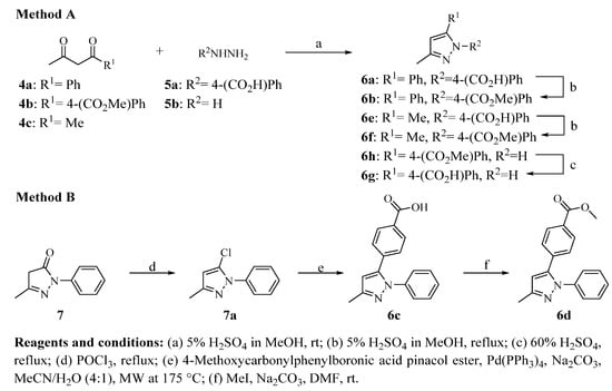 The synthesis of 3,5-disubstituted pyrazole derivatives is displayed in Scheme 2. Pyrazoles 6a, 6e, and 6h were prepared by cyclocondensation of the 1,3-dicarbonyl compounds (4a–c) and 4-hydrazinylbenzoic acid (5a) or hydrazine (5b) with diluted H2SO4 in MeOH at room temperature (Scheme 2, Method A) [21]. Compounds 6b and 6f were obtained by Fischer–Speier esterification from carboxylic acids 6a and 6e, respectively, whereas hydrolysis of 6h produced the carboxylic acid 6g in good yields. Compound 6c was synthesized through a two-step sequence starting from 5-methyl-2-phenyl-2,4-dihydro-3H-pyrazol-3-one (7), which was first converted to 5-chloro-pyrazole intermediary (7a) and then coupled with 4-carbomethoxyphenylboronic acid pinacol ester under microwave irradiation (Scheme 2, Method B) [20]. O-Methylation of 6c with methyl iodide at room temperature yielded the ester 6d. It is important to mention that all pyrazole derivatives were obtained with moderate to good yields following the proposed chemical synthesis.