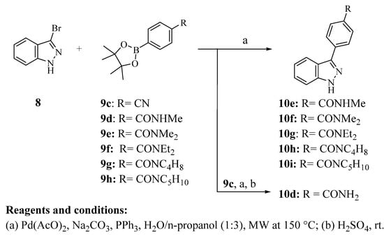 Considering all the data obtained about 2,3-diphenyl indazole amides, as well as molecular simplification used to select the best scaffold, six new 3-phenyl-1H-indazole derivatives bearing small or bulky amides were synthesized (10d–i). These compounds were synthetized through the Suzuki-Miyaura reaction of coupling 3-bromo-1H-indazole (8) with several 4-phenylboronic acid pinacol esters (9c–h) (Scheme 4) [22]. Yields of carboxamide derivatives were lower compared to their unsubstituted or carboxylic acid analogs. The above indicates that phenylboronic acid pinacol esters with a carboxamide group are less reactive.