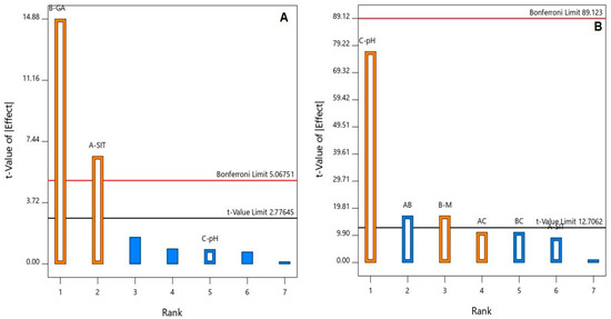Standardized Pareto chart for the (A) particle size and (B) zeta potential of the SIT-GA nano-conjugates.