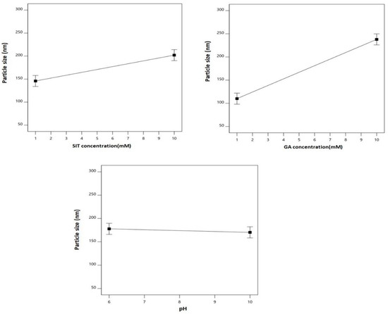 Figure 2 graphically illustrates the individual effects of the assessed variables on the particle size. As clearly depicted, the size increased with increases in both SIT and GA concentrations.