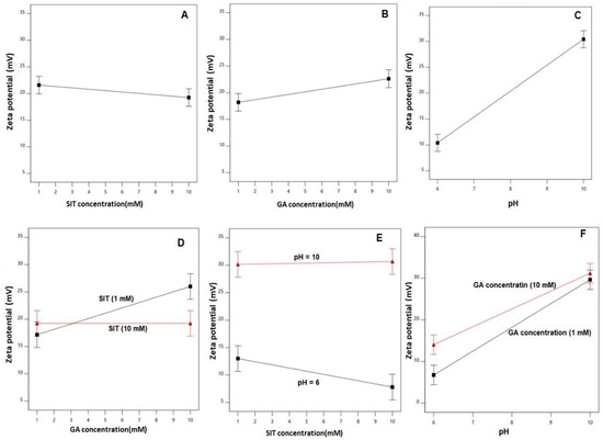 The main effects of the studied factors and the 2FI between these factors on the zeta potential are graphically represented in Figure 3.