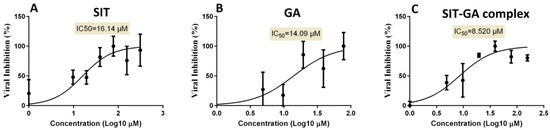 Determination of the half-maximal inhibitory concentration (IC50) of (A) SIT, (B) GA, and (C) SIT-GA nano-conjugates against SARS-CoV-2 (Vero-E6 infected cells).