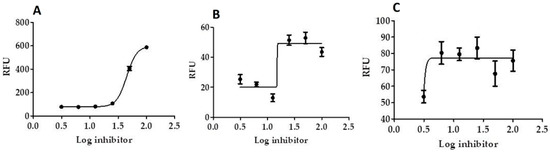 Inhibition of 3CL protease enzyme activity by SIT (A), GA (B), and (C) SIT-GA nano-conjugates. RFU = relative fluorescence units.