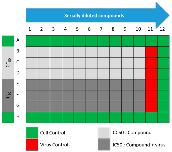 Schematic representation of the 96-well plates used for IC50 and half-maximal cytotoxic concentration (CC50) determinations.