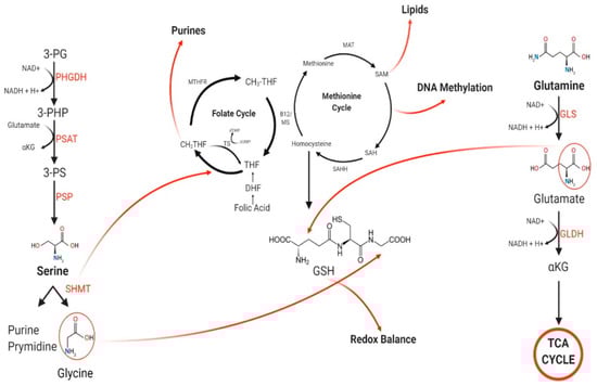 Schematic of the interaction between the three metabolic pathways (serine biosynthesis, 1-C metabolism, and glutamine metabolism). Serine is synthesized from 3-phosphoglycerate (3-PG) by phosphoglycerate dehydrogenase (PHGDH), phosphoserine aminotransferase (PSAT), and phosphoserine phosphatase (PSP). Serine is further converted to glycine by SHMT, which donates a carbon to the folate cycle. Tetrahydrofolate (THF) is converted to CH3THF by TS and MTHFR to complete the folate cycle. During demethylation of CH3THF, a carbon is donated to the methionine cycle by Vitamin B12. Methionine is synthesized to homocysteine by methionine adenosyltransferase (MAT) and SAAH, producing S-adenosylmethionine (SAM) and S-adenosylhomocysteine (SAH). Glutamine is converted to glutamate by the enzyme glutaminase. The side chain of glutamate is then used to form GSH. Abbreviations 3-PG—3-phosphoglycerate; PHGDH— phosphoglycerate dehydrogenase; PSAT—phosphoserine aminotransferase; 3-PHP—3-phosphohydroxypyruvate; 3-PS—3-phosphoserine; PSP—phosphoserine phosphatase; SHMT—serine hydroxymethyltransferase; TS—Thymidylate Synthase; dUMP—deoxyuridine monophosphate; dTMP—deoxythymidine monophosphate; MTHFR—methylenetetrahydrofolate reductase; THF—tetrahydrofolate; CH3THF—5-methyltetrahydrofolate; CH2THF—5,10-methylene-THF; B12—Vitamin B12; MS—Methionine synthase; MAT—Methionine adenyltransferase; SAM—S-adenosylmethionine; SAH—S-adenosylhomocysteine; SAHH—S-adenosylhomocysteine hydrolase; GSH—Glutathione; GLS—Glutaminase; GLDH—Glutamate dehydrogenase; TCA—tricarboxylic acid. Created with BioRender.com (accessed on 16 February 2021).