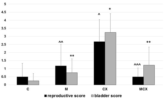 Total reproductive score (testes, epididymes and sperm, 0–6 points) and total urinary bladder score (hemorrhage, edema, erosions, 0–6 points). Scoring system described in the Material and Methods section. Bladder score: * p < 0.001, CX vs. C; ** p < 0.001, M vs.CX and MCX vs. CX. Reproductive score: ^ p < 0.01, CX vs. C; ^^ p < 0.05, M vs. CX and ^^^ p < 0.01, MCX vs. CX. Data presented as mean values and SD.