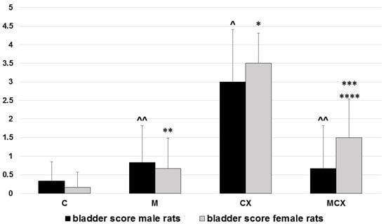 Total urinary bladder score (hemorrhage, edema, erosions, 0–6 points) in male and female rats. Scoring system described in the Material and Methods section. Male rats: ^ p < 0.001, CX vs. C; ^^ p < 0.01, M vs. CX and MCX vs. CX. female rats: * p < 0.001, CX vs. C; ** p < 0.001, M vs.CX; *** p < 0.01, MCX vs. CX; **** p < 0.05, MCX vs. C. Data presented as mean values.