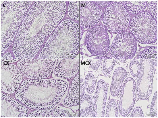 Histological cross-sections of testes (HE staining, magnification 200×). C—control group—appearance of normal testis with orderly maturation of germ cells from the base to the center of the lumen: numerous spermatogonia (along the basement membrane), primary and secondary spermatocytes, spermatids, and spermatozoa; M— Morin-5′-sulfonic acid sodium salt (NaMSA) receiving group—appearance of normal testis: the seminiferous tubules with numerous germ cells; CX—cyclophosphamide receiving group—changes grade 2—the seminiferous tubules with loss of germ cells, there is an orderly maturation of germ cells from the base to the center of the lumen, but the number of spermatogonia (along the basement membrane), primary and secondary spermatocytes, spermatids, and spermatozoa is decreased; MCX—group receiving cyclophosphamide and NaMSA—changes grade 1—the seminiferous tubules with discrete germ cells loss, there is an orderly maturation of germ cells from the base to the center of the lumen, but the number of spermatogonia (along the basement membrane), primary and secondary spermatocytes, spermatids, and spermatozoa is slightly reduced.