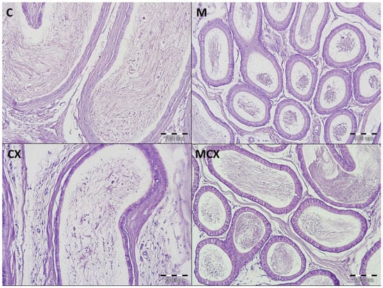 Histological cross-sections of epididymes (HE staining, magnification 200×). C—control group—no pathological changes, tubules have thick muscular coat, the lining is composed of tall, ciliated columnar cells, without atypia; M—NaMSA receiving group—no pathological changes, tubules have thick muscular coat, the lining is composed of tall, ciliated columnar cells, without atypia; CX—cyclophosphamide receiving group—changes grade 1—tubules have thick muscular coat, the lining is composed of tall, ciliated columnar cells, with some discrete changes; MCX—group receiving cyclophosphamide and NaMSA—no pathological changes, tubules have thick muscular coat, the lining is composed of tall, ciliated columnar cells, without atypia.