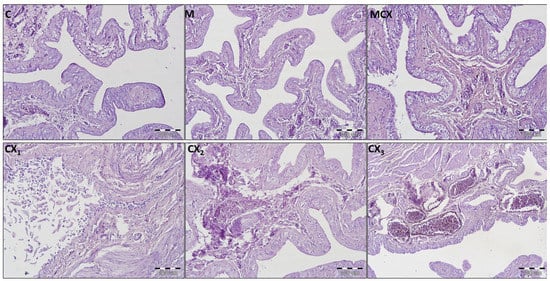Histological cross-sections of urinary bladders (HE staining, magnification 200×). C—control group—no pathological changes; M—group receiving NaMSA—edema and discrete hyperemia of submucosa, there are normal 5–7 layers of transitional epithelium without atypia and some slightly dilated blood vessels; MCX—group receiving cyclophosphamide and NaMSA—edema of submucosa, there are normal 5–7 layers of transitional epithelium without atypia and some slightly dilated blood vessels; CX—group receiving cyclophosphamide—selected characteristic abnormalities; CX1—erosion of normal transitional epithelium without inflammation; CX2—edema and discrete hyperemia of submucosa, there are normal 5–7 layers of transitional epithelium without atypia and some slightly dilated blood vessels; CX3—high degree hyperemia of submucosa, there are normal 5–7 layers of transitional epithelium without atypia and some significantly dilated blood vessels.