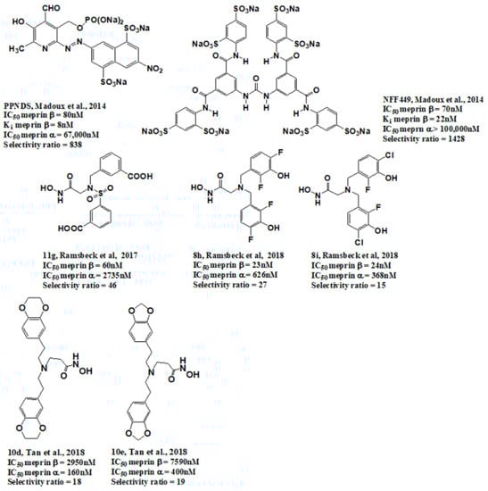 Synthetic selective meprin inhibitors described to date.