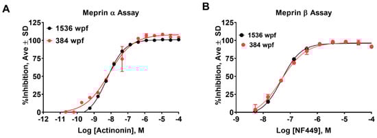 Assay recapitulation in 1536 well plate format. Concentration response studies in 384 and 1536 well plate formats showed similar potency of pharmacological controls for (A) meprin α (actinonin) and (B) meprin β (NF449) assays. Both assays were performed in triplicate.