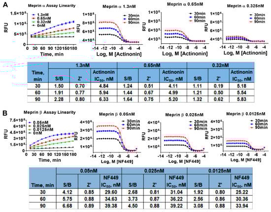 Enzyme concentration and time of reaction optimization experiments in 1536 wpf. (A) Meprin α 1536 wpf assay optimization study. (B) Meprin β 1536 wpf assay optimization study. Experiments repeated twice, n=4. S/B-signal-to-basal ratio.