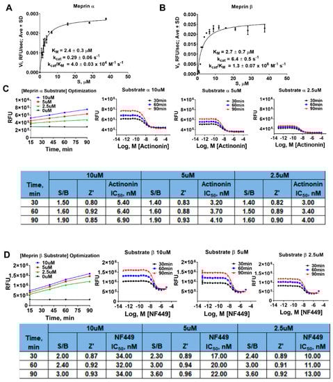Next, we performed substrate optimization to achieve balanced assay conditions defined as [S]/KM = 1 [19]. In order to do that, we first determined kinetic parameters of proteolysis of meprin α and meprin β substrates by the respective enzymes (Figure 4A,B). Meprin α and meprin β proteolysis exhibited similar KM values (2.4 ± 0.3 µM and 2.7 ± 0.7 µM, respectively) suggesting the need for optimization of both assays’ substrate concentration. Meprin β exhibited >20-fold faster turnover of its substrate than meprin α (6.4 ± 0.06 s-1 versus 0.29 ± 0.06 s-1, respectively) which is consistent with >100-fold difference in enzyme concentrations for meprin α and meprin β assays (1.3 nM versus 0.0125 nM, respectively). To optimize substrate concentrations, both assays were run for 90 min at three different substrate concentrations (10, 5, and 2.5 µM) which included the concentration at which the assays were recapitulated in 1536 wpf (10 µM for both meprin α and meprin β) and the concentration approximating [S]/KM = 1 condition (2.5 µM). Enzyme concentrations were fixed at 1.3 nM for meprin α and 0.0125 nM for meprin β. QC parameters (Z’ and S/B) and IC50 values of pharmacological controls (actinonin and NFF449) were calculated at 40, 60, and 90 min of the reaction time (Figure 4C,D). The 2.5 µM substrate condition resulted in increased apparent potency of pharmacological controls for both assays (2-fold for actinonin in the meprin α assay and 3-fold for NFF449 in the meprin β assay). This suggested that 2.5 µM substrate concentrations result in greater assay sensitivity. Assay QC parameters (S/B and Z’) at 2.5 µM substrate concentrations did not differ significantly from assays run at 10 µM substrate concentrations; therefore, we chose 2.5 µM substrate concentrations as a final assay condition.