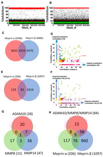 After removal of a handful of duplicates, Venn analysis showed that 1416 compounds inhibited both meprins, while there were 3632 compounds selectively inhibiting meprin α and 3470 compounds selectively inhibiting meprin β (Figure 5C). Correlational analysis showed 48 and 39 compounds selectively inhibiting meprin α and meprin β, respectively, with a percentage inhibition ≥ 50 (Figure 5D).