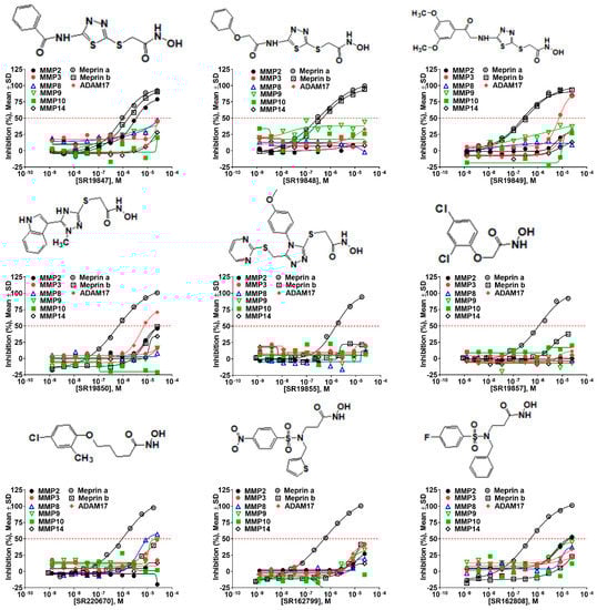 The top nine compounds exhibited IC50 values ≤ 1 µM against meprin α (Table 2). Examination of the structures of meprin α top hits revealed that they fall into four groups (Figure 6), thiadiazole-hydroxyacetamides (SR19849, SR19848, SR19847), triazole-hydroxyacetamides (SR19850, SR19855), sulfonamide-hydroxypropanamides (SR162808, SR162799), and phenoxy-hydroxyacetamides (SR1220670, SR1596857). SR162808 was the most potent and selective inhibitor of meprin α with an IC50 value of 0.446 µM and >30-fold selectivity against meprin β and other tested metzincins (Table 2). Both sulfonamide-hydroxypropanamides (SR162808 and SR162799) exhibited sub-micromolar IC50 values for meprin α inhibition and >30-fold selectivity against meprin β and other tested metzincins.