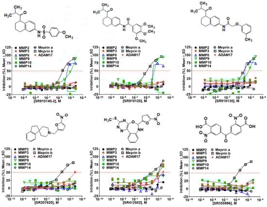 We were able to procure 64 out of 87 selected compounds from commercial sources, which we tested in triplicate, 10-point, 3:1 serial dilution concentration response format starting at the highest concentration of 17.4 µM against both meprin α and meprin β. In addition to meprins, we also tested 64 hits against related metzincins (MMP-2, MMP-3, MMP-8, MMP-9, MMP-10, MMP-14, ADAM10, and ADAM17) to ascertain general nonpromiscuity against zinc-dependent proteases.