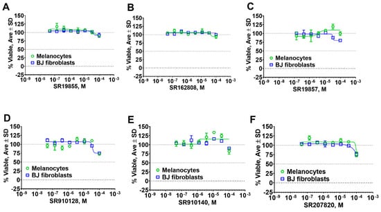 We also tested representative compounds from each scaffold for effects on skin fibroblast and melanocyte viability to ascertain cytotoxicity towards various skin cell types. Overall, hits showed either no or very little effect on cell viability (Figure 8) suggesting a lack of general cytotoxicity and amenability of hit chemotypes for the development into in vitro probe for biological studies.