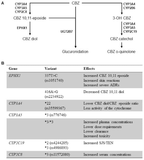 Pharmacokinetics (PK) and pharmacogenomics of carbamazepine (CBZ). (A) Liver metabolism of CBZ by cytochrome P450 (CYP) enzymes, epoxide hydrolase 1 (EPXH1), and UDP-glucuronosyltransferase (UGT) and relative metabolites. (B) Genetic polymorphisms in genes involved in CBZ metabolism and their effects on PK of the drug. Abbreviations. (*) allele nomenclature; ADR, adverse drug reactions; SJS/TEN, Steven-Johnson syndrome/toxic epidermal necrolysis.