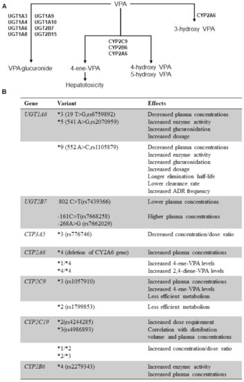 Pharmacokinetics (PK) and pharmacogenomics of valproate (VPA). (A) Liver metabolism of VPA by cytochrome P450 (CYP), UDP-glucuronosyltransferase (UGT) enzymes, and relative metabolites. (B) Genetic polymorphisms in genes involved in VPA metabolism and their effects on PK of the drug. Abbreviations. (*) allele nomenclature; ADR, adverse drug reactions.