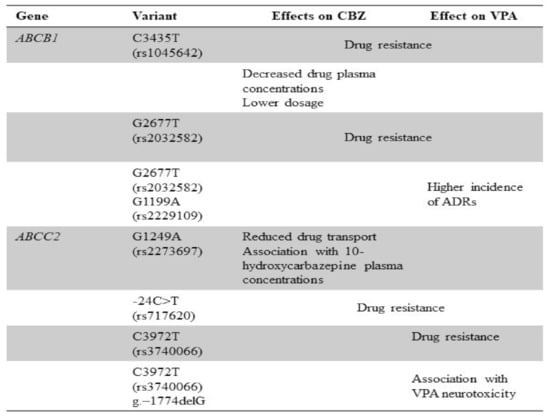 Several studies have identified a correlation between ABCC2 gene variants and the risk of resistance to antiepileptic drugs with contradictory results. ABCC2 common variants c.1249G>A (p.V417I, rs2273697) and c.3972C>T (p.I1324I, rs3740066) showed no significant associations with the responsiveness to anticonvulsant drugs, especially CBZ, while only c.-24C>T (5′UTR, rs717620) polymorphism was a risk factor for resistance to therapy in epileptic patients [124]. Indeed, nonsynonymous polymorphism c.1249G>A was associated with reduced CBZ transport but not with drug response in epilepsy patients, while the A-allele of ABCC2 single nucleotide polymorphism c.1249G>A is related to neurological ADRs [125,126,127]. In addition, carriers of ABCC2 1249G>A variant were more frequently responders to antiepileptic drugs especially CBZ or oxcarbazepine; conversely, ABCC2 -24C>T and 3972C>T did not influence CBZ response [128,129]. ABCC2 rs2273697 polymorphism was significantly associated with 10-hydroxycarbazepine plasma concentrations and might be a predictor of non-responsiveness in non-Asian patients, while ABCC2 rs717620 CT+TT and rs3740066 778 CT+TT genotypes were over-represented in epileptic patients resistant to CBZ and other antiepileptic drugs in Chinese population, especially female [130,131]. Multidrug resistance-associated protein 1 (MRP1), encoded by the ABCC1 gene, was overexpressed in neurons and astrocytes of drug resistant epileptic patients, and its inhibition could locally increase drug availability [132].