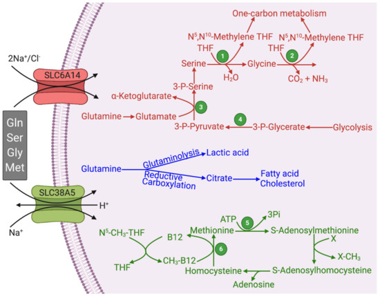 Chicago/Turabian StyleSniegowski, Tyler, Ksenija Korac, Yangzom D. Bhutia, and Vadivel Ganapathy. 2021. "SLC6A14 and SLC38A5 Drive the Glutaminolysis and Serine–Glycine–One-Carbon Pathways in Cancer" Pharmaceuticals 14, no. 3: 216. https://doi.org/10.3390/ph14030216